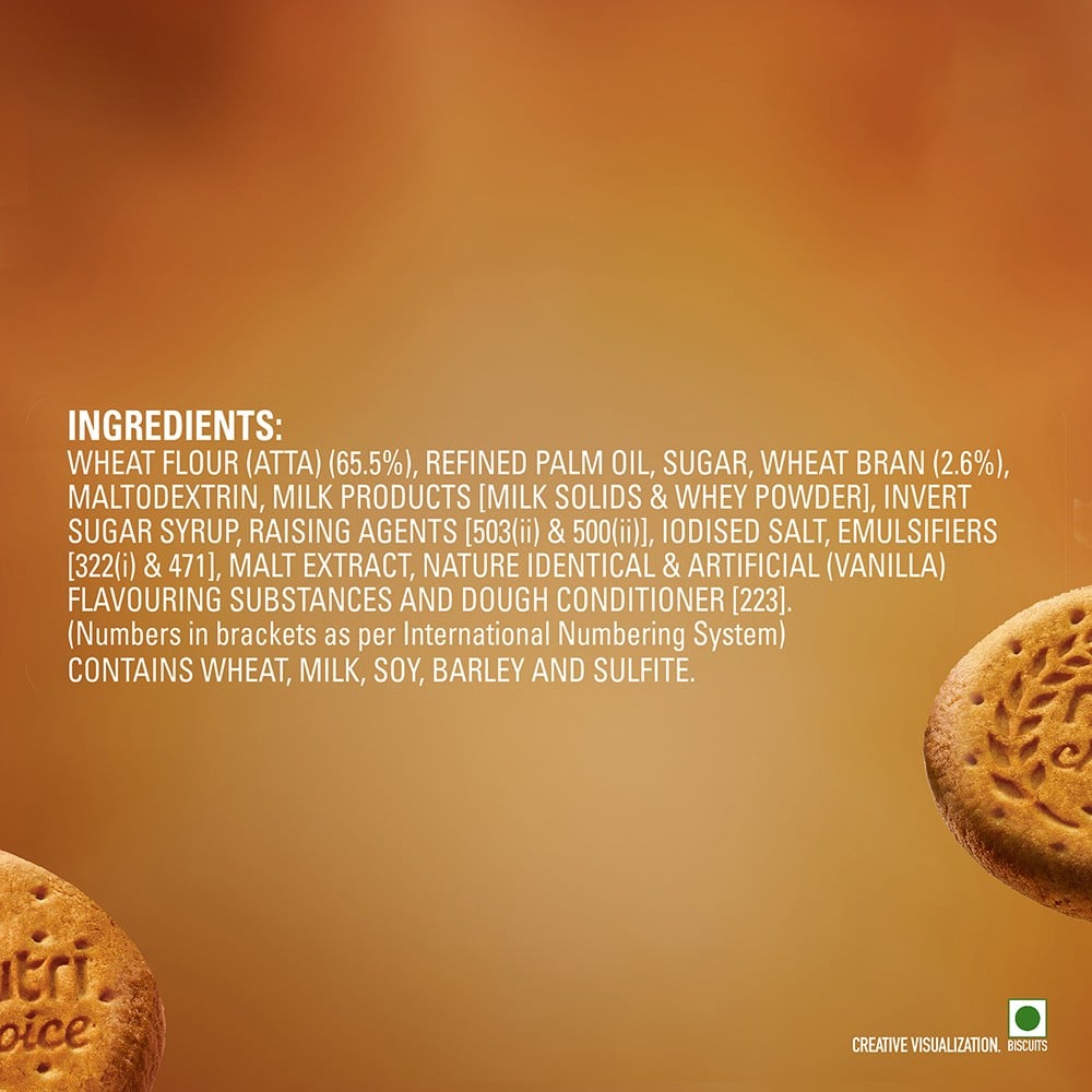 Wheat Flour (Atta) (65.5%), Refined Palm Oil, Sugar, Wheat Bran (2.6%), Maltodextrin, Milk Products (Milk Solids & Whey Powder), Invert Sugar Syrup, Raising Agents [503(Ii) & 500(Ii)], Iodised Salt, Emulsifiers [322(I) & 471], Malt Extract, Nature Identical & Artificial (Vanilla) Flavouring Substances And Dough Conditioner (223).
