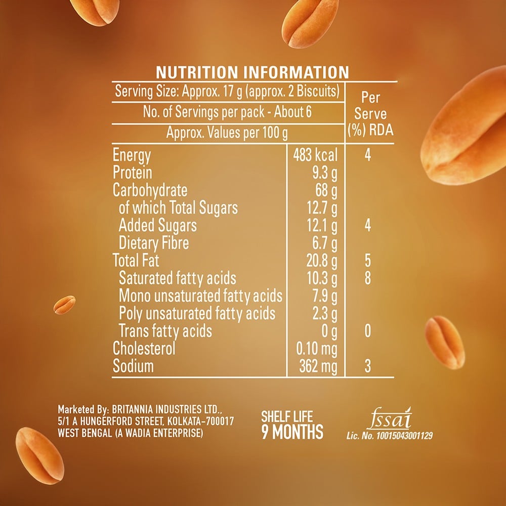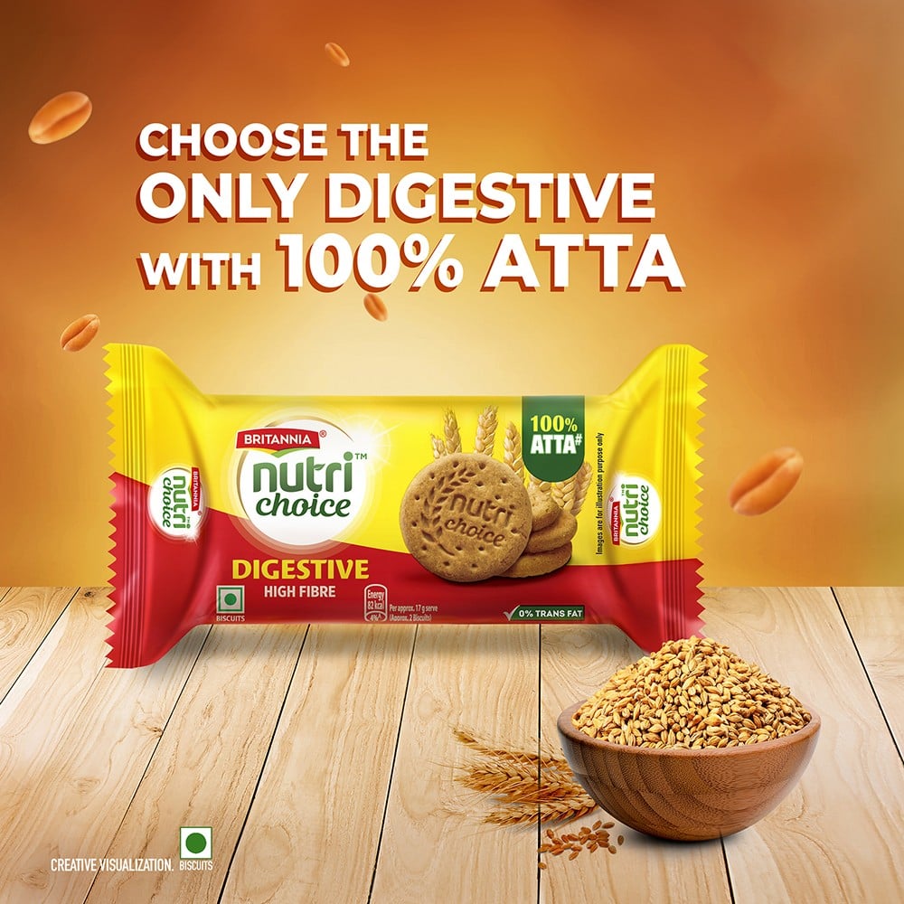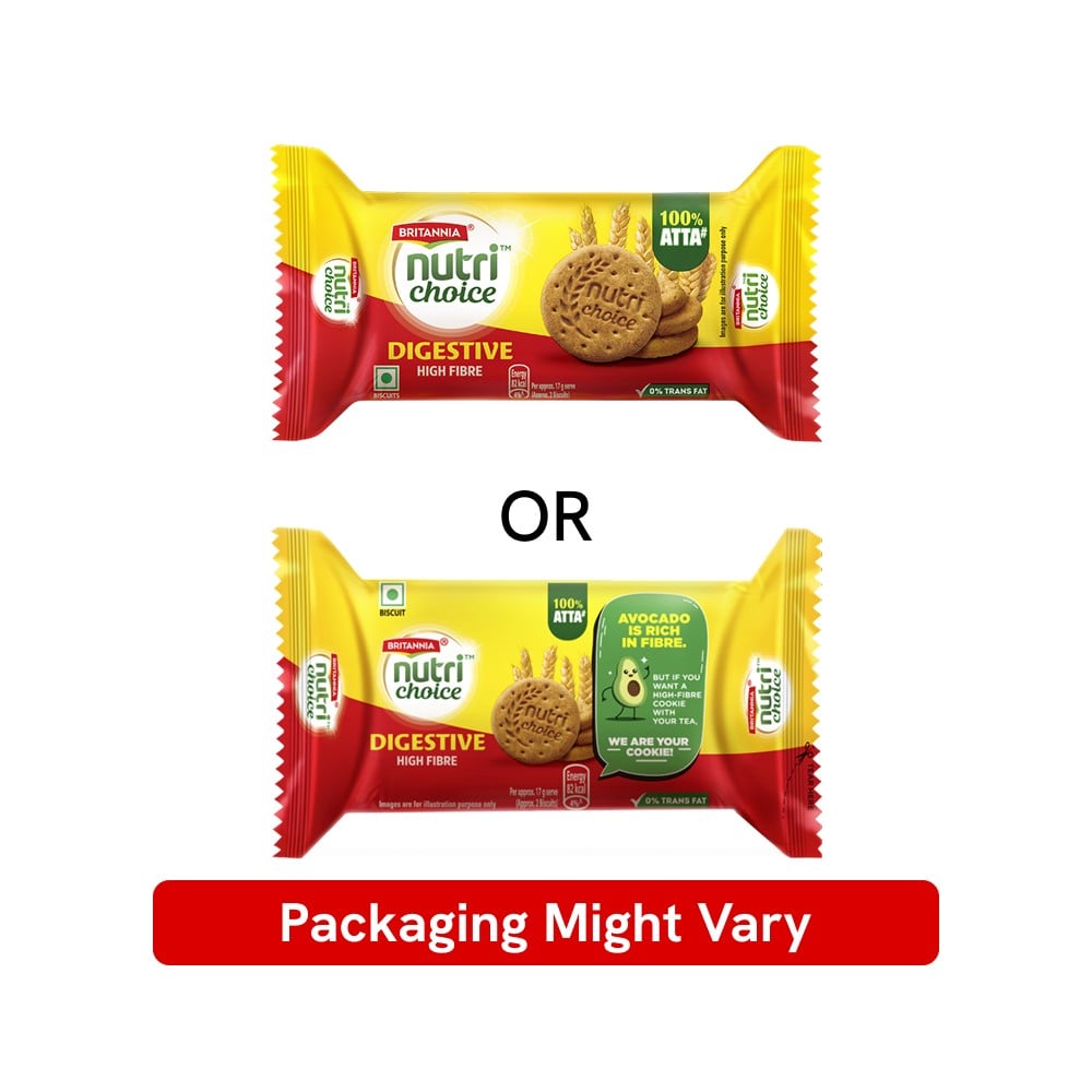 Britannia NutriChoice Digestive Biscuits are fibre-rich biscuits packed with the richness of wheat flour (atta) and bran. With every bite, you experience the coarseness of this fibre-rich biscuit. These Digestive cookies are baked to precision, making them a great snack option. Available in a large pack with 50g free. Go ahead and make a good choice.