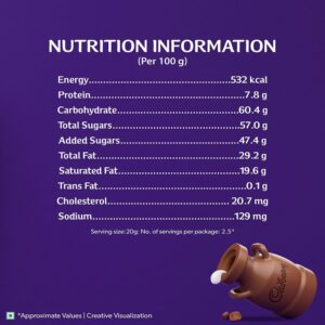 Nutrition information (per 100 g) *- Energy 532 kcal, Protein 7.8 g, Carbohydrate 60.4 g, Total Sugars 57.0 g, Added Sugars 47.4 g, Total Fat 29.2 g, Saturated Fat 19.6 g, Trans Fat 0.1 g, Cholesterol 20.7 mg, Sodium 129 mg.
