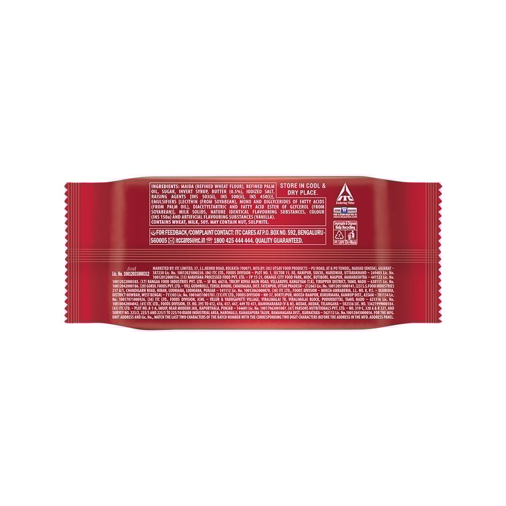 Wheat Flour, Sugar, Edible Vegetable Oil, Butter (6.5%), Raising Agents (INS 503 (ii), Baking Powder), Milk Solids, Invert Syrup, Edible Common Salt and Emulsifiers (INS 322, INS 471 and INS 472e), Contains Added Flavour(s) (Nature Identical Flavouring Substances-Butter and Artificial Flavouring Substances-Butter, Milk and Vanilla).